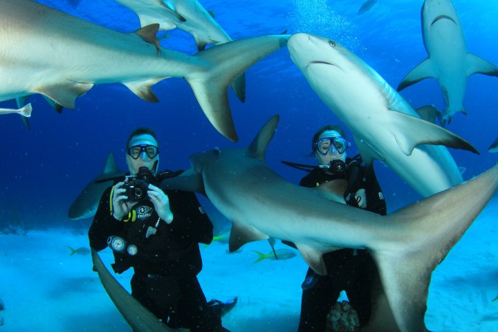 In the photo, I’m the diver on the right – the one about to be smacked in the face with a shark tail. Close encounters with science!